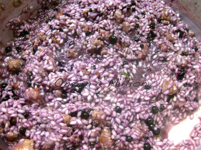 Quando si sarà asciugata la maggior parte del liquido, versatevi il resto e dopo circa 15 minuti da quando avete versato il primo brodo (quindi a 5 minuti dalla fine cottura), unite i mirtilli lavati e continuate a mescolare (avendo cura di evitare i mestoli di legno che assorbono anche il colore, oltre al sapore).