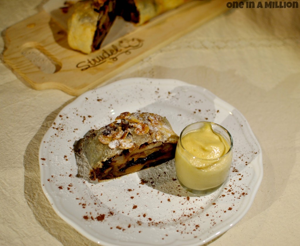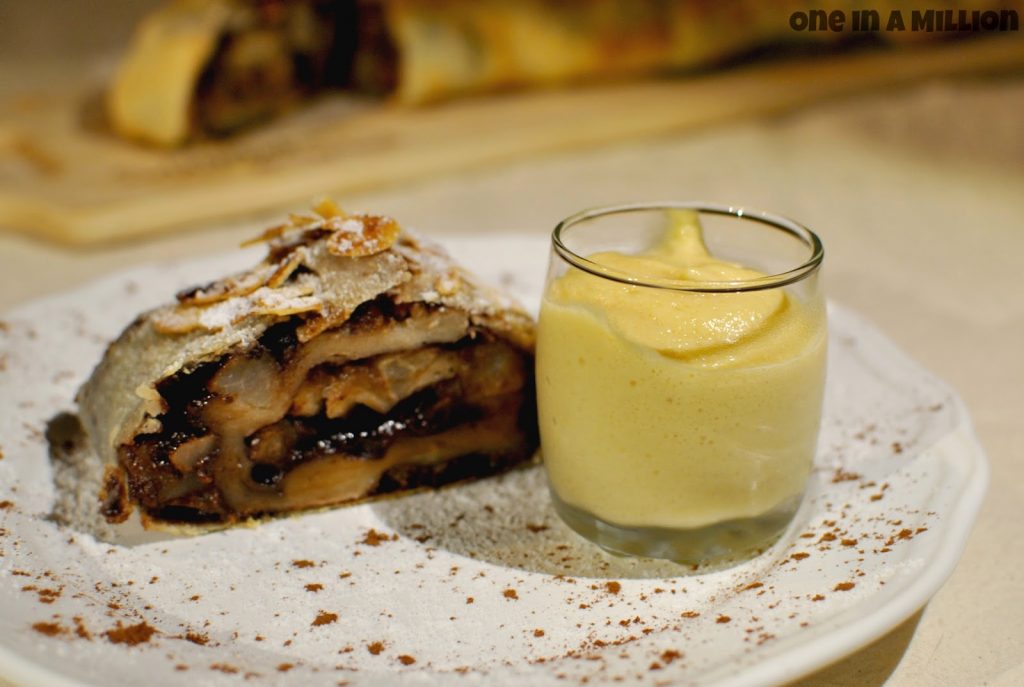 Togliete lo strudel dal forno, lasciatelo intiepidire, quindi tagliatelo e servitelo con lo zabaione accanto, magari in un bicchierino, spolverato di zucchero a velo.
