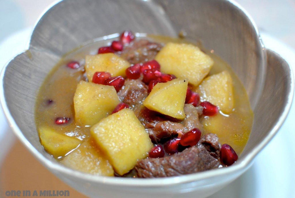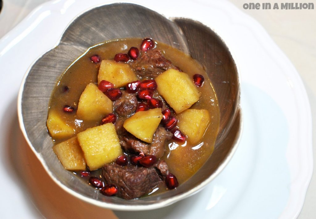 La melagrana ha un colore bellissimo, però non la conosco molto quindi, come tanti cibi ultimamente ho deciso di provarla in una variante di questa splendida ricetta, con l’aggiunta delle cipolle rosse, qualche spezia, e usando la carne di manzo.