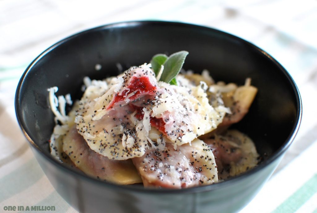 Versate il burro bollente sulle mezzelune, spolverate con i semi di papavero ed ultimate con la ricotta!