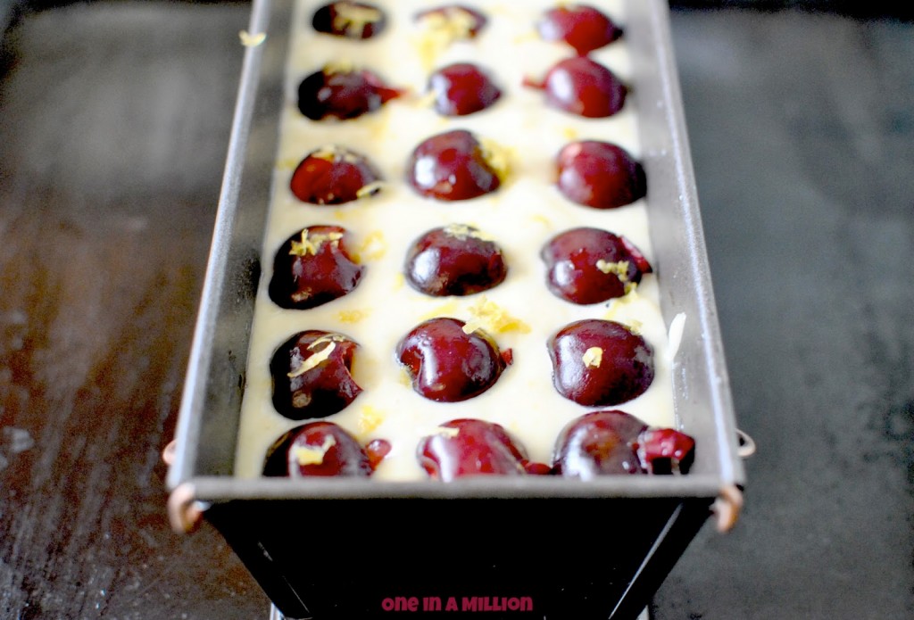 Imburrate uno stampo da cakes e versate circa metà dell’impasto, poi disponete in maniera ordinata circa metà (15) ciliegie e versate il resto del composto.