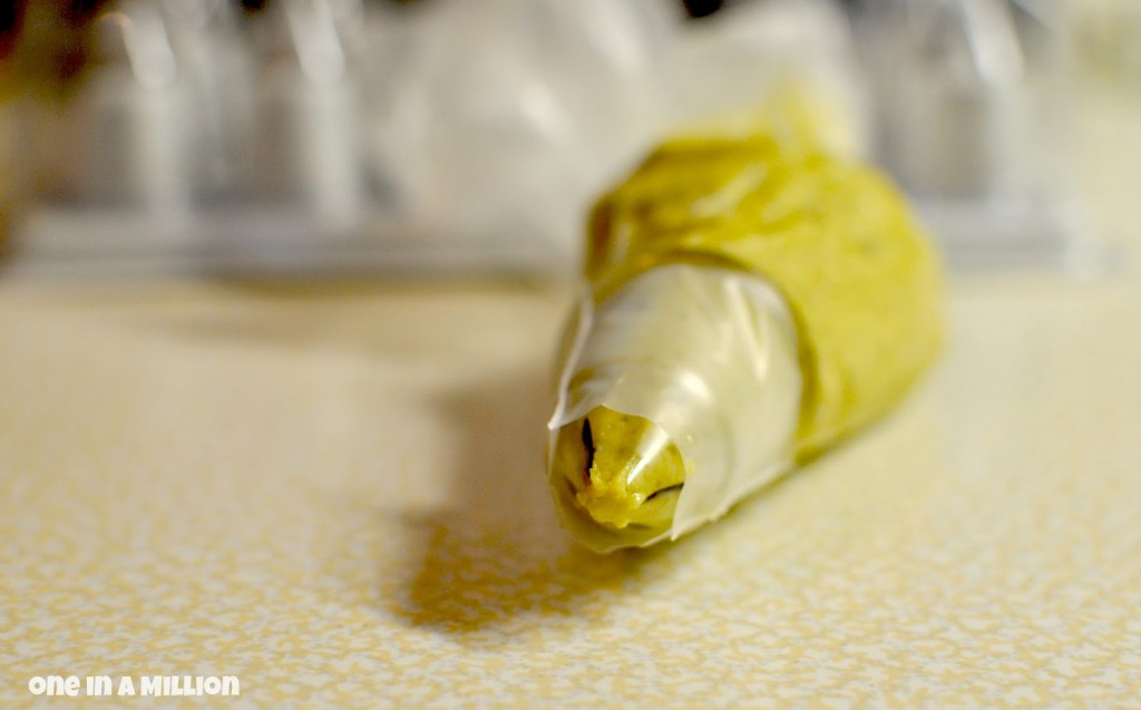 8. Intanto nel bicchiere del mixer ad immersione mettete i cetrioli ed il cren e frullate bene, versando l'olio a filo. Dovrete ottenere una crema semi-liscia, che metterete in una sac à poche con bocchetta a stella.
