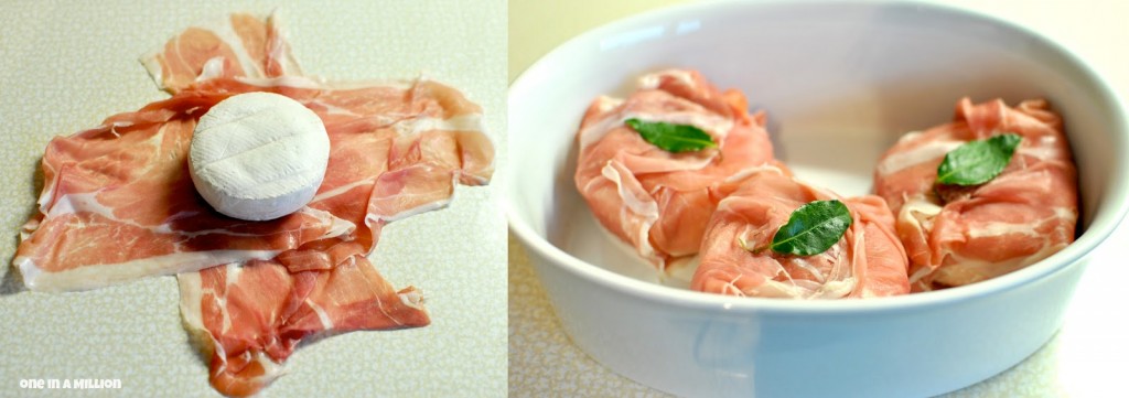 7. Prendete due fette lunghe (o 4 piccole) di crudo di Parma e disponetele a formare una croce, al cui centro posizionerete un tomino, quindi chiudetegli sopra il prosciutto in modo da avvolgerlo completamente. Fate così per tutti i tomini, posizionateli in una teglia da forno (che avrete scaldato fino a 170°), poggiatevi sopra una foglia d'alloro e infornate per circa 20 minuti: il crudo dovrà essere croccante ed il tomino all'interno si sarà sciolto.