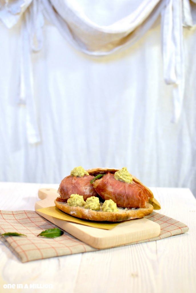 9. Poco prima che i tomini siano pronti tagliate due pagnotte a metà ed infornatele qualche minuto, quindi mettetele su un piatto, poggiatevi il o i tomini avvolti nel crudo, farcite con la crema ai cetrioli, togliete le foglie d'alloro ed addentate: sentirete il morbido ripieno caldo del formaggio avvolgere pane, prosciutto e crema in una sinfonia senza eguali.