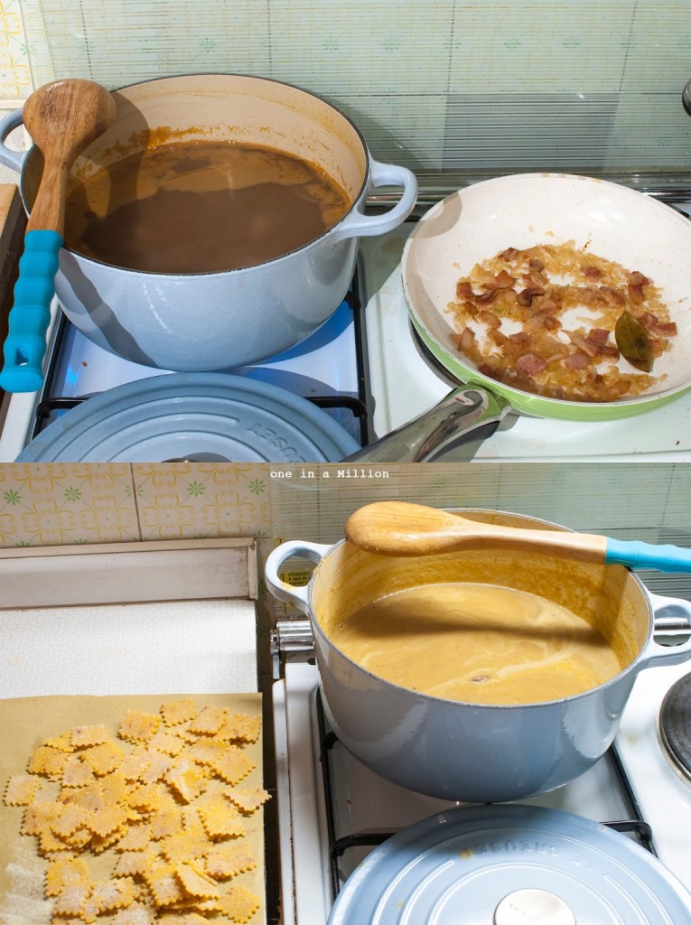 Normalmente la mamma usa come pasta i ditalini rigati, ma io ho voluto prepararla in casa, così ho fatto dei quadrotti resi piccanti dal mio peperoncino in fiocchi che ho preso in SriLanka invece che usarlo nella base, in modo da renderlo più imponente e ben visibile.