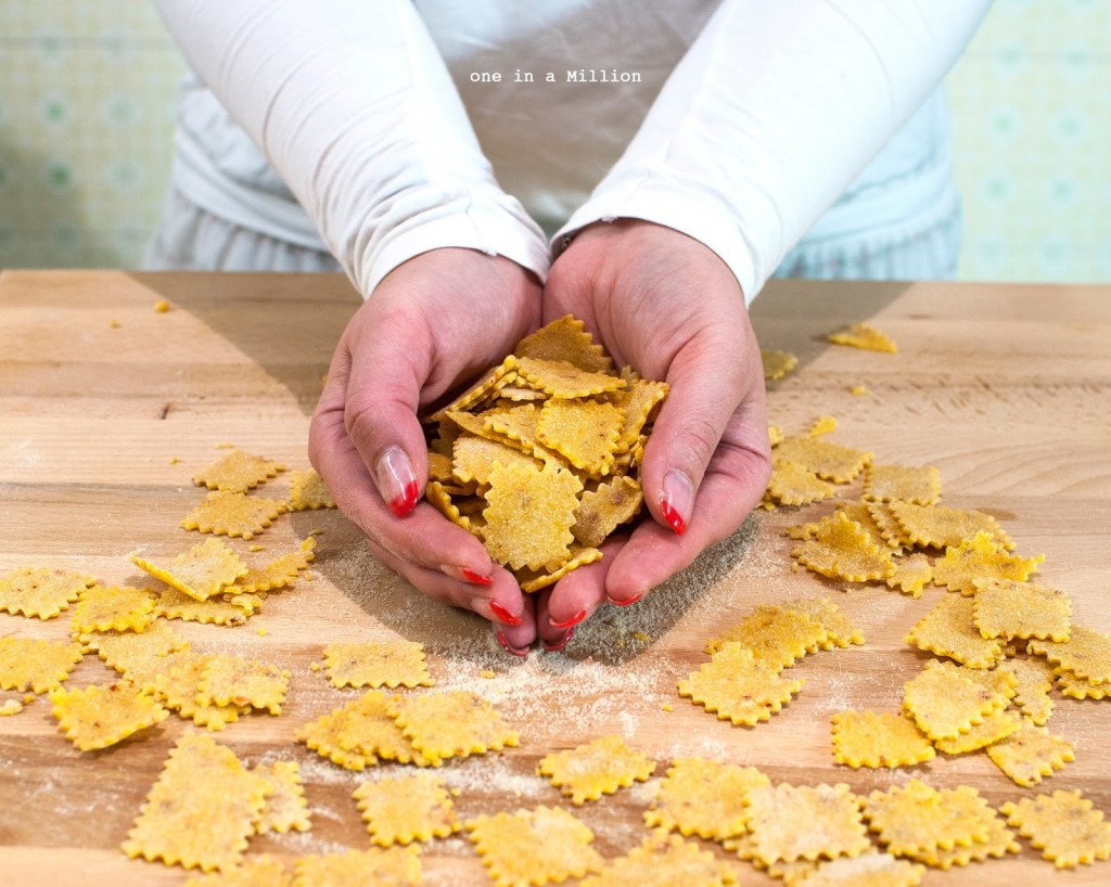 Spolverate bene la spianatoia e stendete finemente la sfoglia, quindi tagliate dei quadrotti di circa 1,5 cm e tenete da parte.