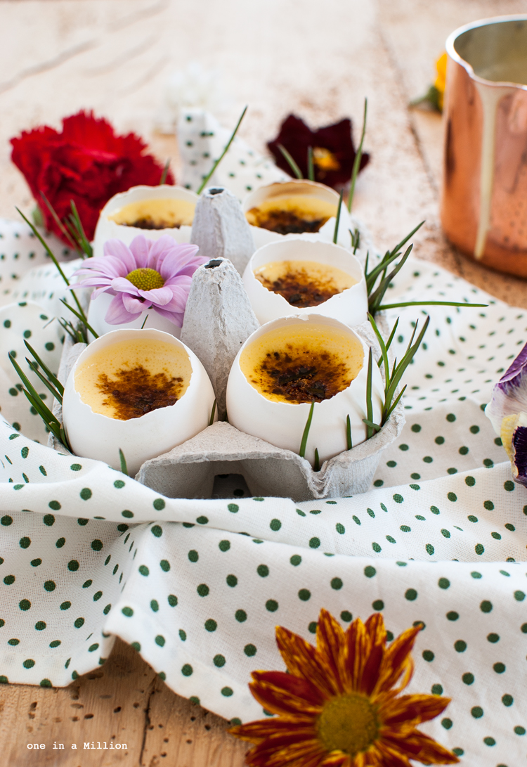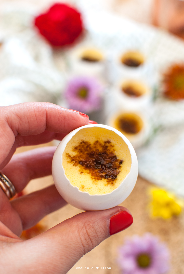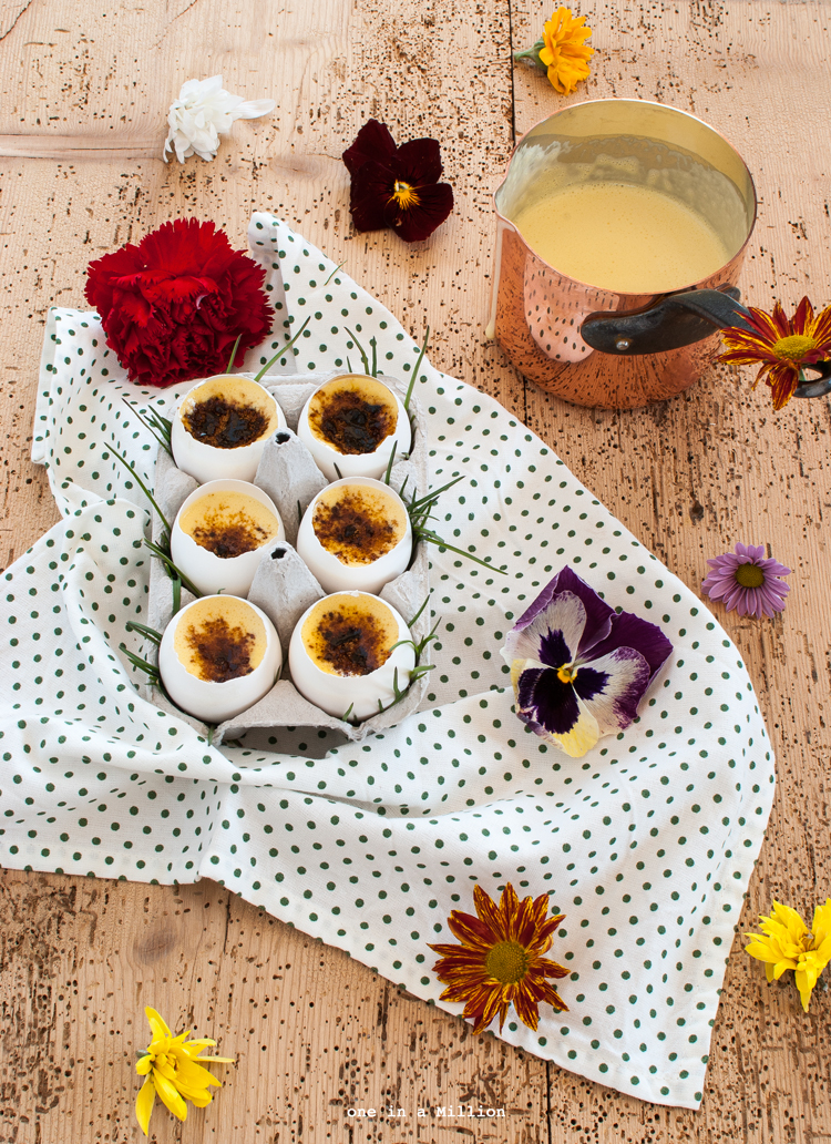 Questa crema non è null’altro che una crema inglese montata alla panna, rifinita con zucchero di canna caramellato e servita nei gusci candidi (si, ho dovuto fare la caccia al tesoro nell’ultima produzione delle uova della nonna di mio marito per scovarne 6 di bianche, candide e di dimensioni simili, ma voi potete tranquillamente usare quelle classiche, sempre che siano rigorosamente di categoria 0 e freschissime!).