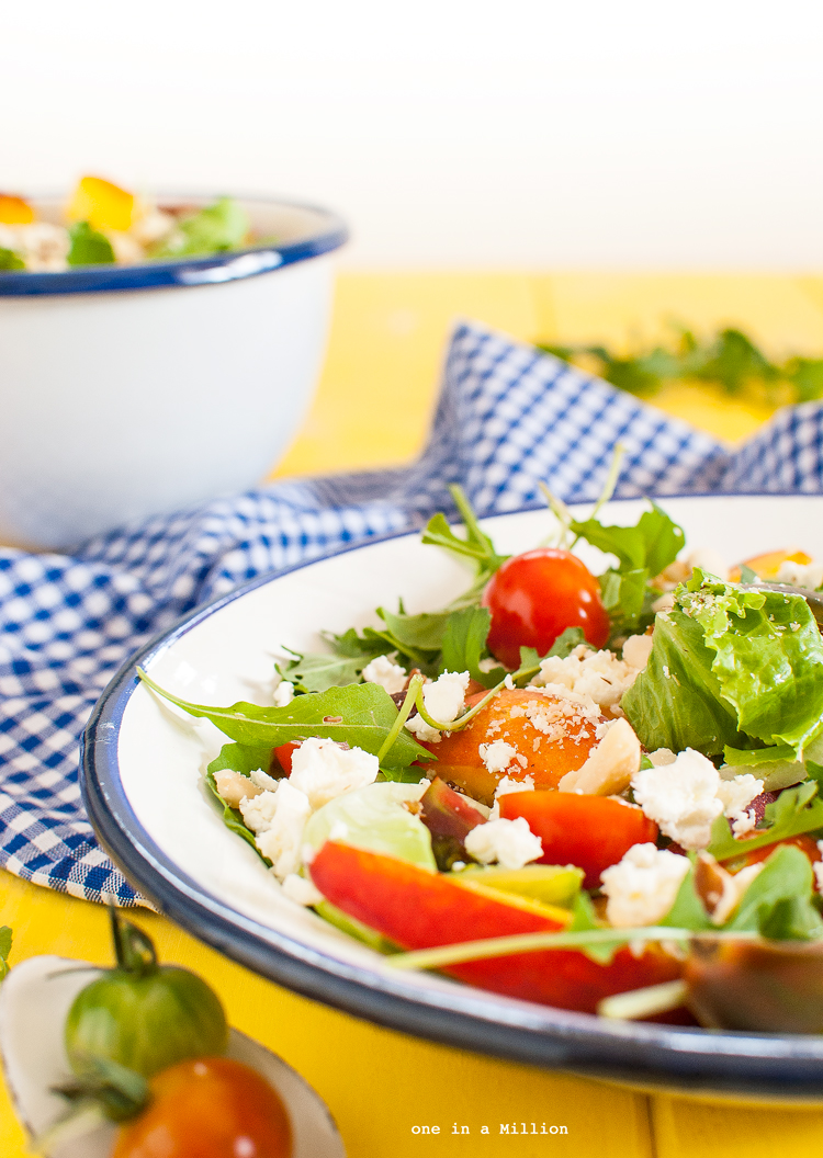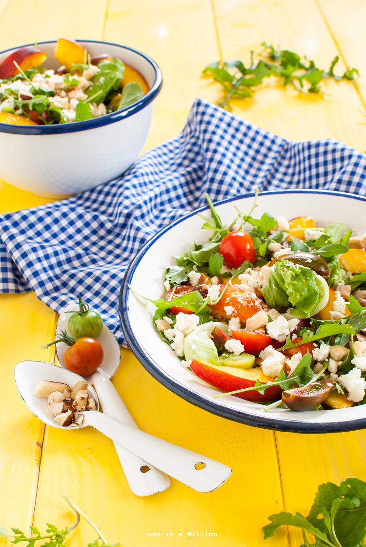 Vi saluto- augurando a chi parte buone ferie, ed a chi rimane in ufficio come me buon lavoro– con un insalata ricca di colori e abbinamenti equilibrati, con le pesche noci, tanta verdura, la feta onnipresente e le noci brasiliane che erano troppe per un pesto con la rucola fatto di recente. Mi sono ispirata ad una ricetta trovata su Naturalmente Goloso (ve ne ho parlato QUI!), ed è perfetta per un pranzo veloce, magari per sfuggire al caldo che imperversa.