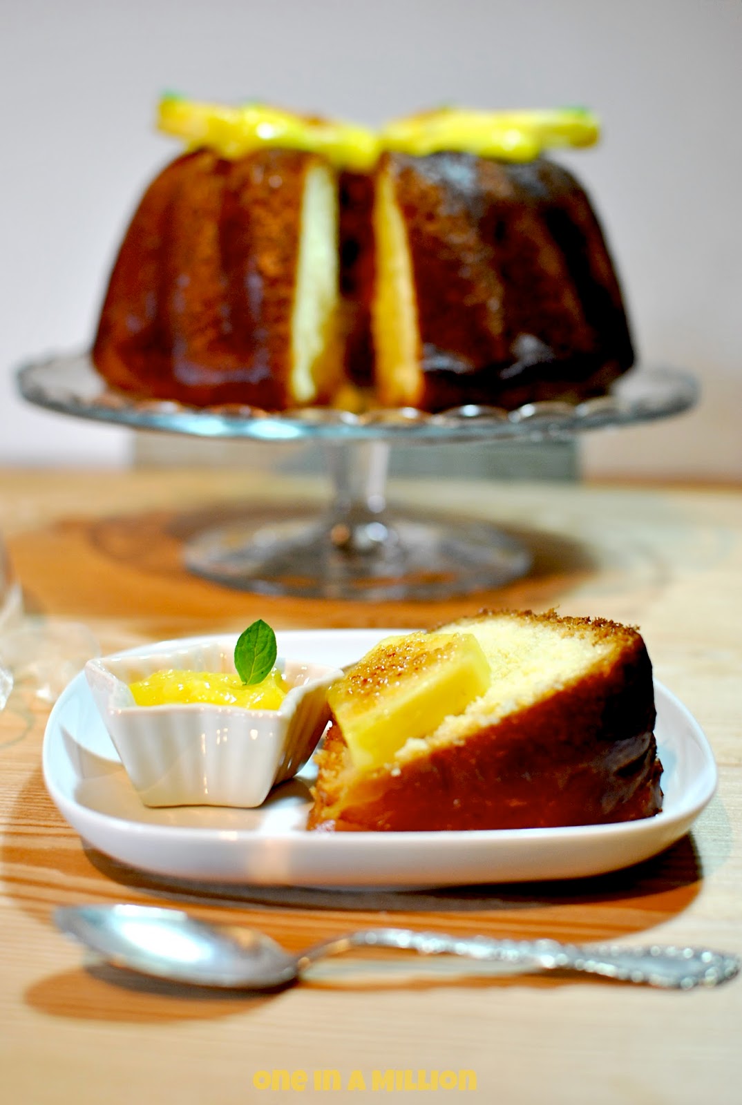 Babà al rum, lemon curd e ananas caramellato, con bagna alla menta e glassato al tarassaco